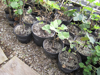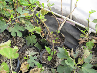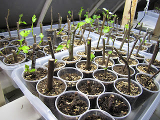 There are around a dozen varieties that have grown slowly and are primarily responsible for the delay (Black Madeira, Figo Preto, I-258, Maltese Beauty, Native de Argentile, Abebereira, etc). There's a 'double whammy' effect, too: not only are these the slowest rooters/growers, they were the most requested, too, so they affect the vast majority of orders. The most salient example is Black Madeira. I have around 20 Black Madeira mother plants that range from 1-4 feet tall, and I need to produce around 150 small well-rooted Black Madeiras to ship. If I get an average of 7 cuttings per mother plant and root them all, I would have about the right amount. But whereas my success rate rooting the vast majority of varieties is around 90%, Black Madeira is more like 50%. That means that I might just get around 70 new Black Madeira plants to survive the rooting process out of the 140 cuttings. But while the slower propagation rate is disappointing, it certainly isn't the end of the world! The total number of Black Madeiras is still growing exponentially, and down the road a little bit when I prune those 90 Black Madeiras (the 20 existing mothers plus the 70 new ones) and get perhaps 500-600 cuttings, that poor propagation rate should still yield 200-300 new Black Madeira trees. So there should be more than enough Black Madeiras to go around soon, it'll just take another rooting cycle. Even in a worst case scenario in which it requires 2 more rooting cycles, I would still be able to finish them this winter and get them shipped out as soon as weather permits, since I'll be growing in heated greenhouses all fall and winter.