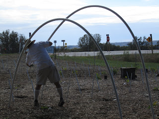 The new tunnels will combine to reach almost 1,000 feet in total length and will be covered by around 1/3 of a mile of greenhouse plastic (double layered for insulation), which will be removed for seasonal storage in the spring. The pics below show the 5' long 3/4" EMT metal conduit that we hammered into the ground to serve as footers for 20' long 1.5" thick schedule 40 PVC pipes that will form the ribs of the tunnel. The PVC pipes are due to arrive tomorrow, and should go up fast :)