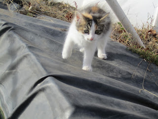 I was working in the fig orchard about 2-3 weeks ago when I heard a baby animal crying, and saw it stranded out in the intersection of the nearby highway. A passerby stopped his car and ran out to pick up the kitten, which was trying to drag itself with its front legs, unable to move its hips or hind legs. I went around our fence and met the guy at the side of the road. He said he couldn't take it home, and I said I would. So my family took her in and nursed her back to health, and now after just a few weeks she is healthy, happy, and active, with full use of all of her legs and no lingering ill effects :) :) She loves to follow us everywhere we walk now, almost like a dog. She's an awesome little cat!