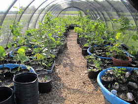 Here are a bunch of potted figs that were up-potted and moved into this shadehouse a day or two before this pic (which is why they're pouting a little bit).  There are around 600 trees in this pic, and there are about 600 more that are this same size/age that aren't pictured.