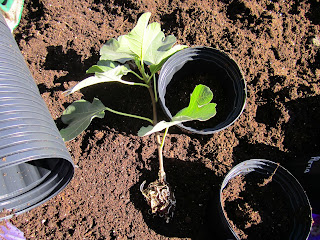 Not all of the orchard has been planted yet, and a few of the empty planting locations that we had marked earlier will need to be moved slightly to get them inside the tunnels, as you can see in the first picture.  (The original line of planting locations had quite a bend in it, and when I made the tunnel line somewhat straight, it resulted in some of the old empty planting locations ending up outside of the tunnel line.)